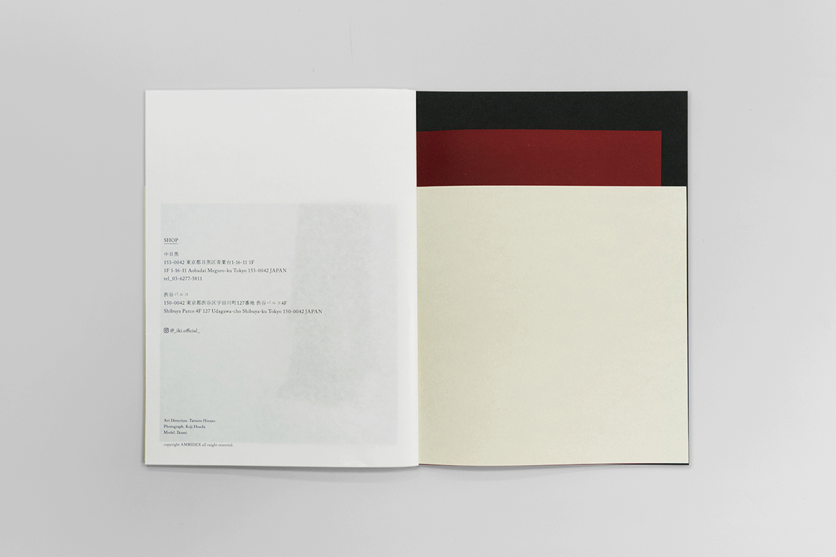 ファッションブランド「iki」のブランド立ち上げに合わせて制作したコンセプトブック。ブランドコンセプトは『シロのおくゆき、クロのおくゆき、その両極に差し込むアカのおくゆき、色に付随した素材のおくゆき、手にして初めて分かる良さ、知る意味』このブランドコンセプトを表現するために、薄い紙を重ね合わせ、『透け』を作ることで奥行きを表現しました。白と黒の深みを表現するために諧調豊かなモノクロフィルムの写真主体で構成しています。