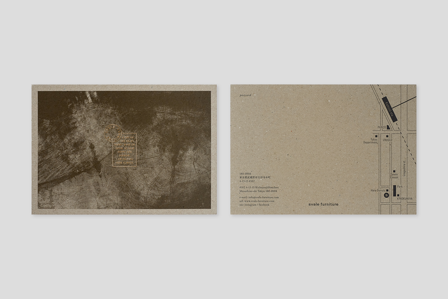 吉祥寺にある木工家具や小物を取り扱う家具屋さんのデザイン。手紙を届けるようにしてお客様に商品を届けるという想いを込めて、切手と消印をモチーフにしてロゴをデザインしました。定期的に制作しているDMでは季節の写真にロゴを載せ、絵葉書のようにしています。
